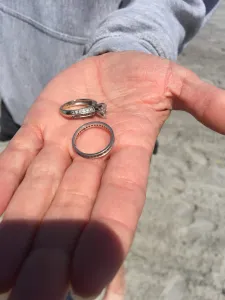 Clients review of service: “Amy Bullock Jones-I highly recommend giving Jeff a call if you are ever in the unfortunate situation of losing a ring(s) or other valuable item on the beach! I lost both of my rings (wedding band and engagement ring) yesterday after taking them off to apply sunscreen….after which I got distracted with five 13 year old girls. I didn’t even realize until later that night that they were missing. After searching every possible bag and beach chair pocket I was certain they were on the beach. The next morning I found Jeff through an internet search thinking I should at least give it a try. Jeff showed up within 1/2 hour of my phone call and went above and beyond to search the entire area I pointed out I thought we were around, and the area we exited the beach. I was absolutely amazed he found them both!! Thank you so much to Jeff for his quick response, extra effort to make sure he covered all areas, and a great result!! Thank you!”
