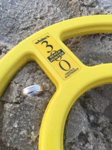 Was tagged in a FB post last Saturday afternoon regarding a wedding band that was lost on the beach. After returning home from a week long vacation I spoke with the client regarding the details and suspected area the ring was dropped. Took the new Whites 300id out for its first recovery as my “go to” unit is out for some repairs and was able to recover the ring in knee deep, low tide, water.