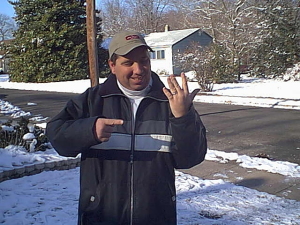 So I went to my car to switch coils from my 6 inch to the 10 inch coil. At this point I was there for about an hour and even though I had gloves on my hands were frozen. So I was attaching the new coil when I looked down and saw the ring sitting there so nice and pretty. It was sitting less than 2 inches from a sewer pipe (no wonder my XLT didn’t find it). So I picked it up and put it on my finger. I knocked on the door and held my finger up. You would not believe the look on his face!! I showed him where I found it, there was still a depression in the snow where it was located. I explained why the machine didn’t find it. I had a smile on my face the rest of the day. #TheRingFindersNewJersey #TheRingFinders #RingFindersSouthJersey
